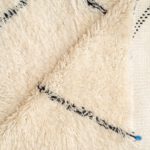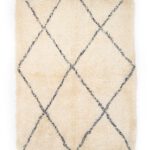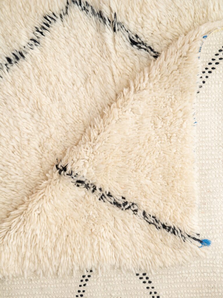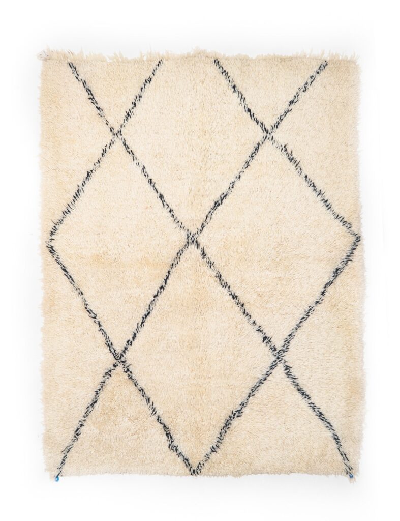 This Beni Ouarain rug (156×200 cm) embodies timeless elegance with its minimalist design. Handwoven from the finest natural wool, its soft ivory base is intersected by bold, hand-drawn black diamond lines—an iconic symbol of Berber artistry. Luxuriously plush yet effortlessly sophisticated, this rug is a perfect statement piece for modern and classic interiors alike.