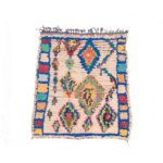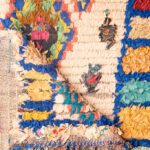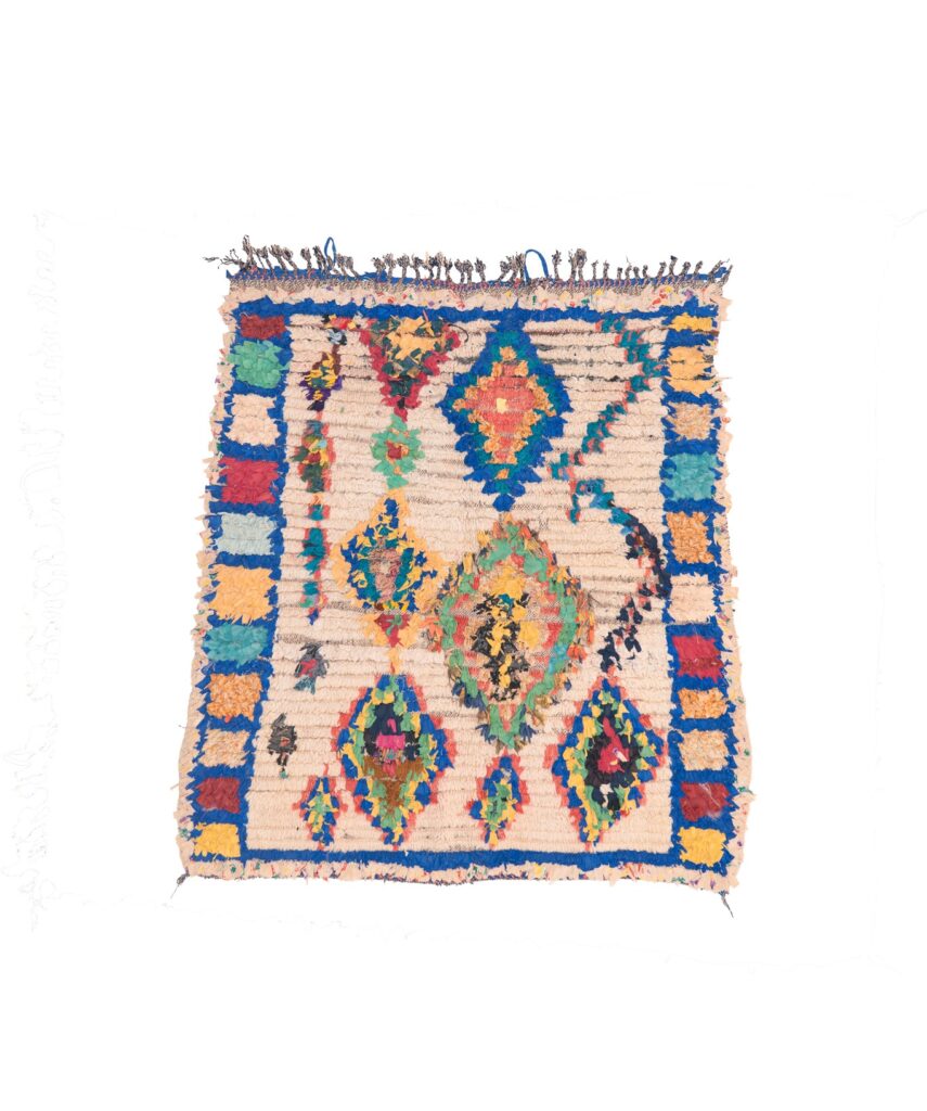This Boucherouite – Ourika rug (100×114 cm) is a vibrant expression of Moroccan artistry, crafted in the Ourika Valley. Handwoven from upcycled fabric, its bold geometric motifs and electric blue frame create a striking contrast against the soft, neutral base. A fusion of sustainability and tradition, this rug adds an eclectic charm to any space.