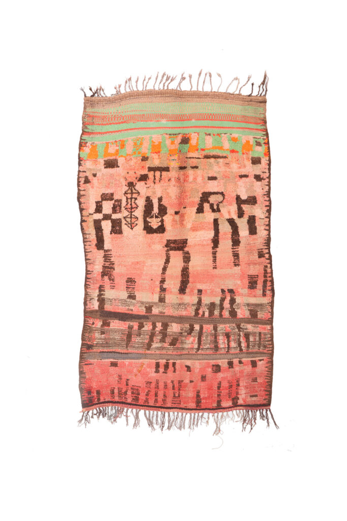 This vintage Boujjaad rug (116×191 cm) is a timeless masterpiece, handwoven 40-50 years ago by Berber artisans. Its warm terracotta hues, tribal motifs, and subtle green accents create a harmonious blend of tradition and artistic expression. A true collector’s piece, this Moroccan rug adds character and soul to any contemporary or bohemian space.