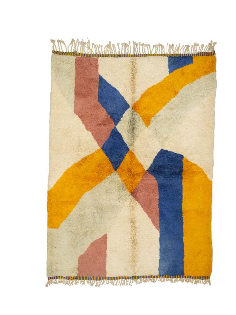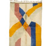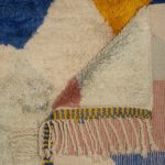 Immerse yourself in the artistic allure of the Mrirt – Bni Mrirt rug. Crafted from pristine white wool, this masterpiece boasts an artistic creation featuring wide yellow, pink, and blue lines. These vibrant hues intertwine harmoniously, forming a captivating tableau that exudes creativity and elegance. Handcrafted with meticulous attention to detail, this rug is not merely a floor covering but a statement piece that will infuse your space with artistic flair and sophistication.