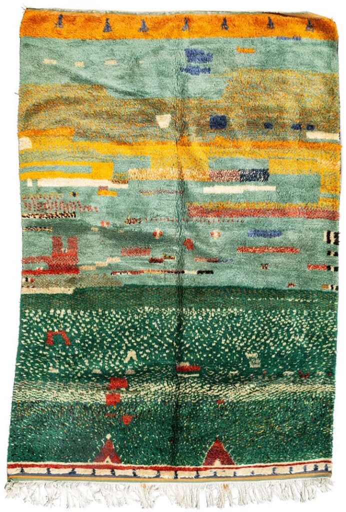 Enhance your space with the vibrant Taznakht rug from Ait Ouaghrda. Measuring 200×300 cm, this handwoven piece features a stunning abstract design in rich green, yellow, and red hues. Perfect for adding a touch of Moroccan elegance and tradition to any room.