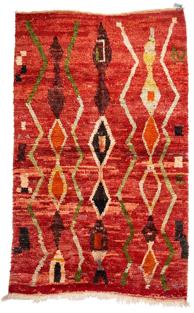 Entdecken Sie die Wärme unseres Boujaad-Teppichs aus der Region Moyen Atlas. Mit einer Grösse von 143×238 cm verleiht dieser rote Teppich Ihrem Raum eine gemütliche Note. Das charmante Raute-Muster schafft eine einladende Atmosphäre, während die warme Farbpalette aus natürlichen Pflanzen wie Blumen und Beeren stammt. Handgefertigt mit Sorgfalt ist dieses einzigartige Stück perfekt, um die Atmosphäre jedes Raumes zu verbessern.