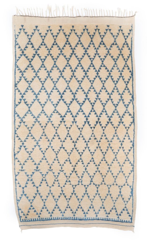 Dieser Taznakht – Ait Ouaghrda-Teppich (112×206 cm) verkörpert die Essenz marokkanischer Handwerkskunst. Die fein gewebte Wollbasis in sanftem Naturton wird durch filigrane blaue Rautenmuster akzentuiert – ein Markenzeichen traditioneller Berberästhetik. Die geometrische Struktur verleiht ihm zeitlose Eleganz und macht ihn zur perfekten Ergänzung für moderne und klassische Räume.