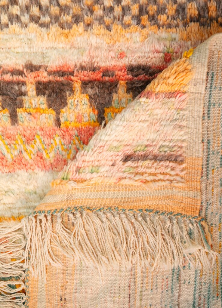 Dieser Azilal-Teppich (107×176 cm) besticht durch seine feinen, vielschichtigen Muster und sanften, warmen Farbtöne. Handgewebt aus natürlicher Wolle, zeigen sich geometrische Bänder in erdigen Nuancen von Ocker, Türkis und Koralle – eine perfekte Symbiose aus Tradition und Moderne. Mit seiner ausdrucksstarken Textur und kunstvollen Details ist er ein vielseitiges Design-Highlight.